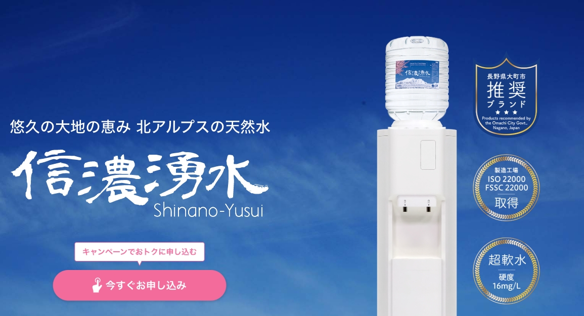 信濃湧水は、北アルプスの自然環境で育まれた天然水を自宅まで届けてくれるウォーターサーバーサービスです。毎日の飲み水としてはもちろん、料理や赤ちゃんのミルク作りなど、さまざまな用途に使いやすい品質の水を提供しています。